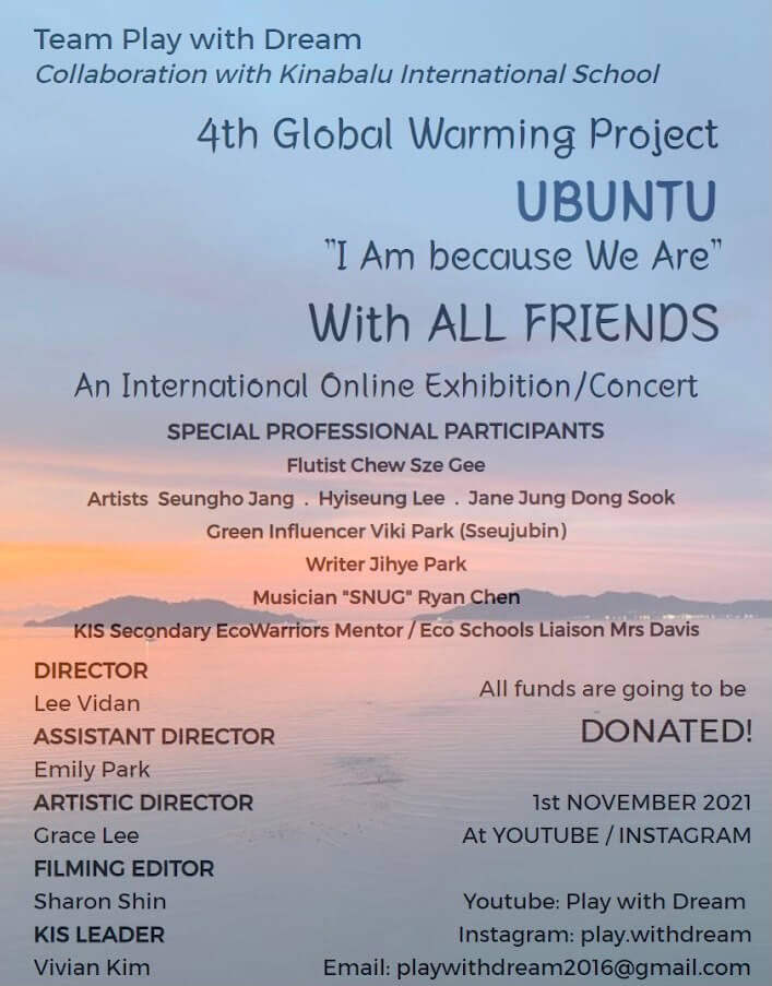 Hello everyone! My name is Grace from Year 10S and I am the artistic director of a small environmental group called Team Play with Dream. I’m really excited to share our 4th Global Warming Project, The 3rd UBUNTU International Online Exhibition/Concert with our community today.