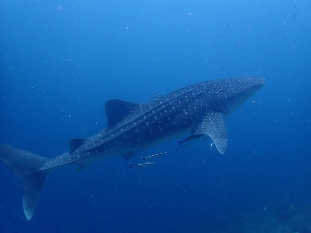 We then headed to a little sheltered beach where we had our surface interval before heading out again, this time for our fun dive, to Sulug Island once more, at Sulaman Reef. We rolled straight back into a world of vibrant color and life, first seeing a huge school of hundreds of bigeye snappers as well as feeding parrotfish, and then seeing the brightest purple nudibranch ever. No one expected that around the corner of the reef, we would run into a baby whale shark (already 5-6m long). The crazy 2023 whale shark season had seemingly subsided for a few weeks, only a few rare sightings around the park and no more krill (whale shark food), and yet against all the odds, at exactly the right place and time, we spotted one! It looped around us slowly before fading away into the blue, leaving us stunned mid-water.
