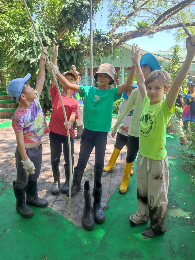 We stopped off at the small nursery where we filled seedling pots with mud and placed them alongside the growing saplings ready to be planted. Then it was time to open our trash sacks and cautiously step through the mud and around the tangled roots to retrieve discarded items of rubbish. Plastic bottles were everywhere and we got better at spotting them through the mud as the morning went on (though perhaps not better at accurately judging how deep some of the mud would be). Arlo’s cream trousers will never be the same again!