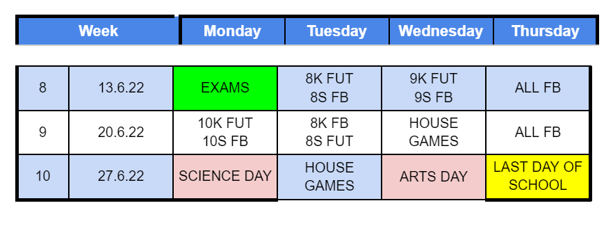 The Sport Mornings will replace students’ normal PE lessons for that week. Students will need to come to school dressed in their PE uniforms on the day of their particular Sport Morning. They will also need their PE hat and a large water bottle to stay hydrated and energised throughout the morning’s events. The dates for which are outlined below.