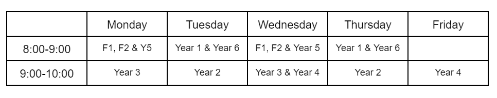 Primary parents should have seen the days of their child’s PE lessons shared in class timetables through Dojo, but here they are again for your reference.