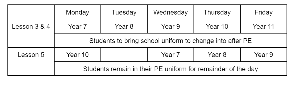 Students in secondary will continue with the policy of wearing the PE uniform to school on the days they have PE. If they have a double lesson for PE lessons 3 & 4 then they will also need to bring their school uniform to change into after the class. Please see here the Secondary PE timetable for your reference.