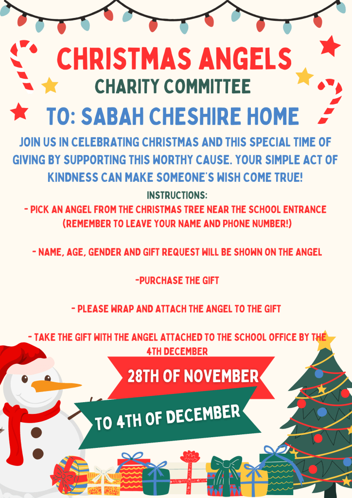 The Christmas Angels Tree can now be seen near the school entrance. Traditionally, and in the spirit of generosity and giving, the KIS community marks this time of the year in our long standing relationship with the KK Cheshire Home by providing much-desired gifts for their clients. I noticed yesterday that there are still quite a lot of Angels on the tree, and I would encourage parents and students to take one. The name, gender and age of the recipient are written on the angel, with the gift request. The Charity Committee and I thank you in advance; the wrapped gifts will be taken to the Home on Tuesday 12th December, to be received with much excitement.