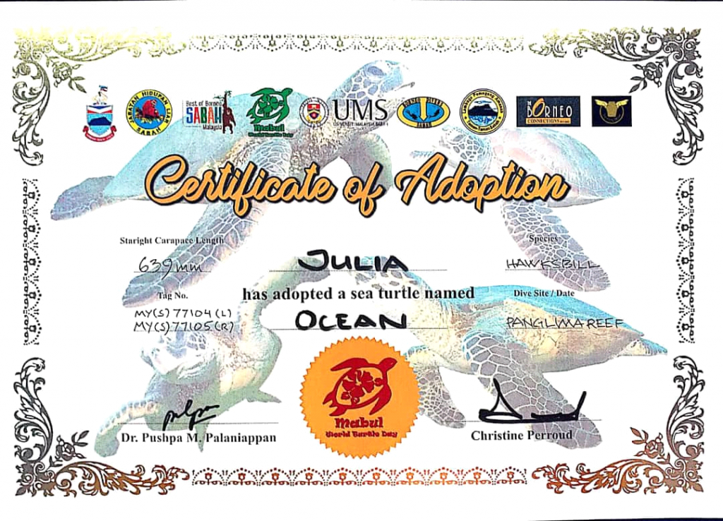 After the official programme was finished, you can adopt a turtle if you want to. Last year I adopted a male juvenile green turtle that I called ‘Will’, so this year I wanted to adopt an adult female hawksbill turtle as they are rare to spot, and I named mine ‘Ocean’. Unfortunately, we didn’t catch Will again this year, so I couldn’t be updated about how much he had grown…hopefully next year, if I go again, I will get to see both my adopted turtles!