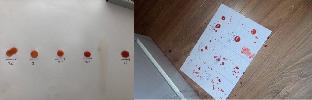 One of these techniques is to study the size and shape of blood splatters, a grisly but effective technique that reveals important information about where and how the blood arrives at different points around the crime scene. The students used fake blood (often tomato ketchup) and dropped or flicked it from different heights to investigate the relationship between the height and the size of the blood splatter. Hopefully no one walked in the room as this was happening and thought a gruesome crime had been committed!
